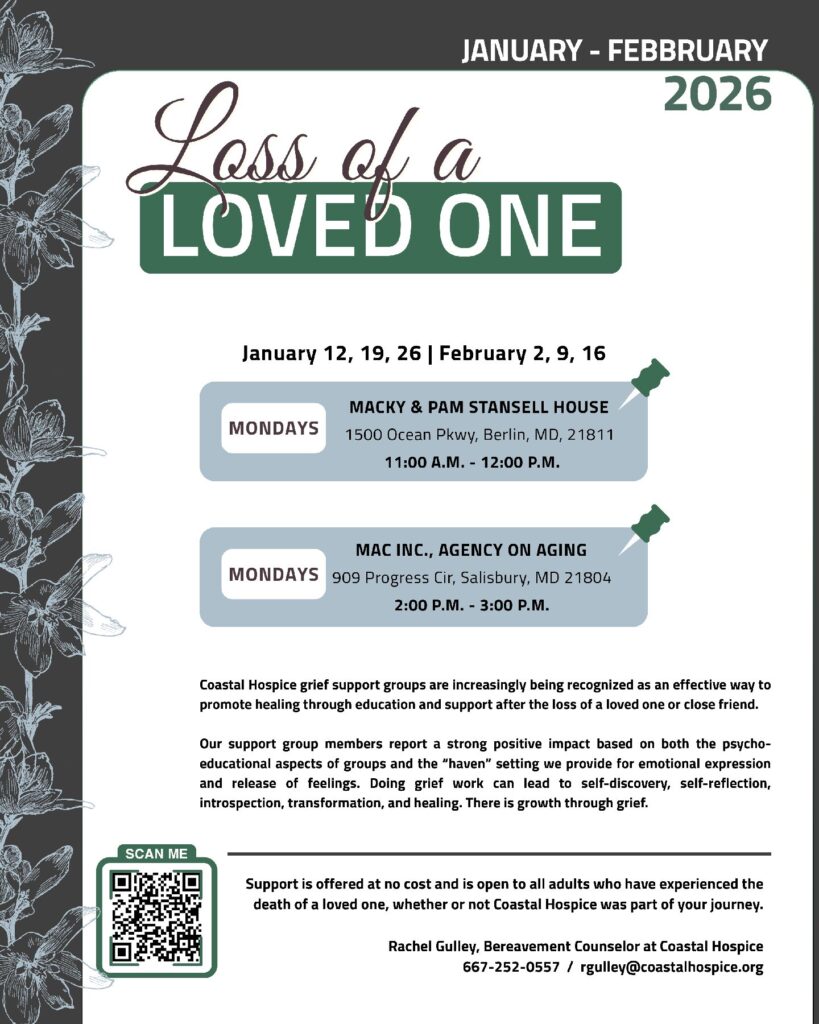 To register, please contact Rachel Gulley, Bereavement Counselor at Coastal Hospice | 667-252-0557 rgulley@coastalhospice.org