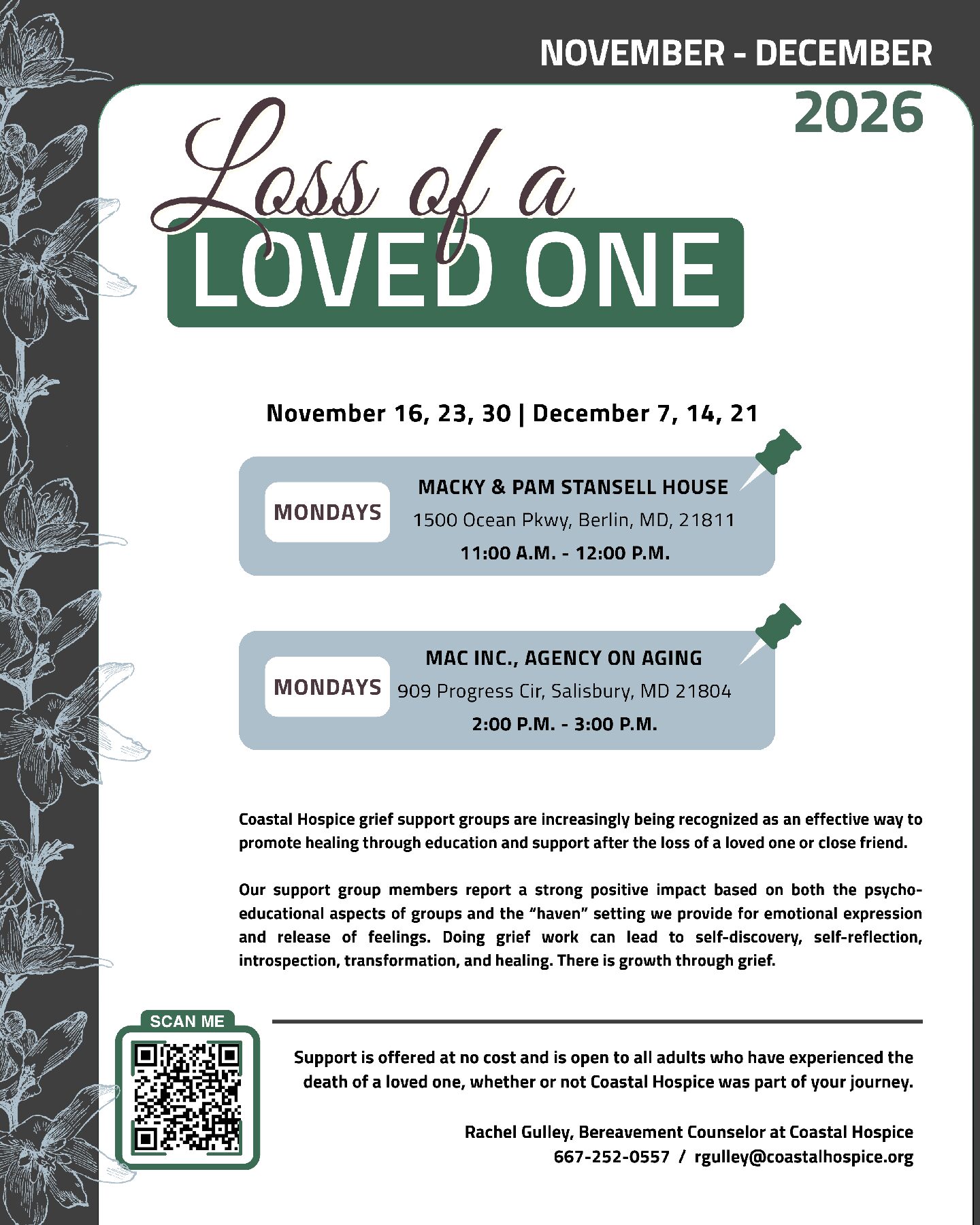 To register, please contact Rachel Gulley, Bereavement Counselor at Coastal Hospice | 667-252-0557 rgulley@coastalhospice.org