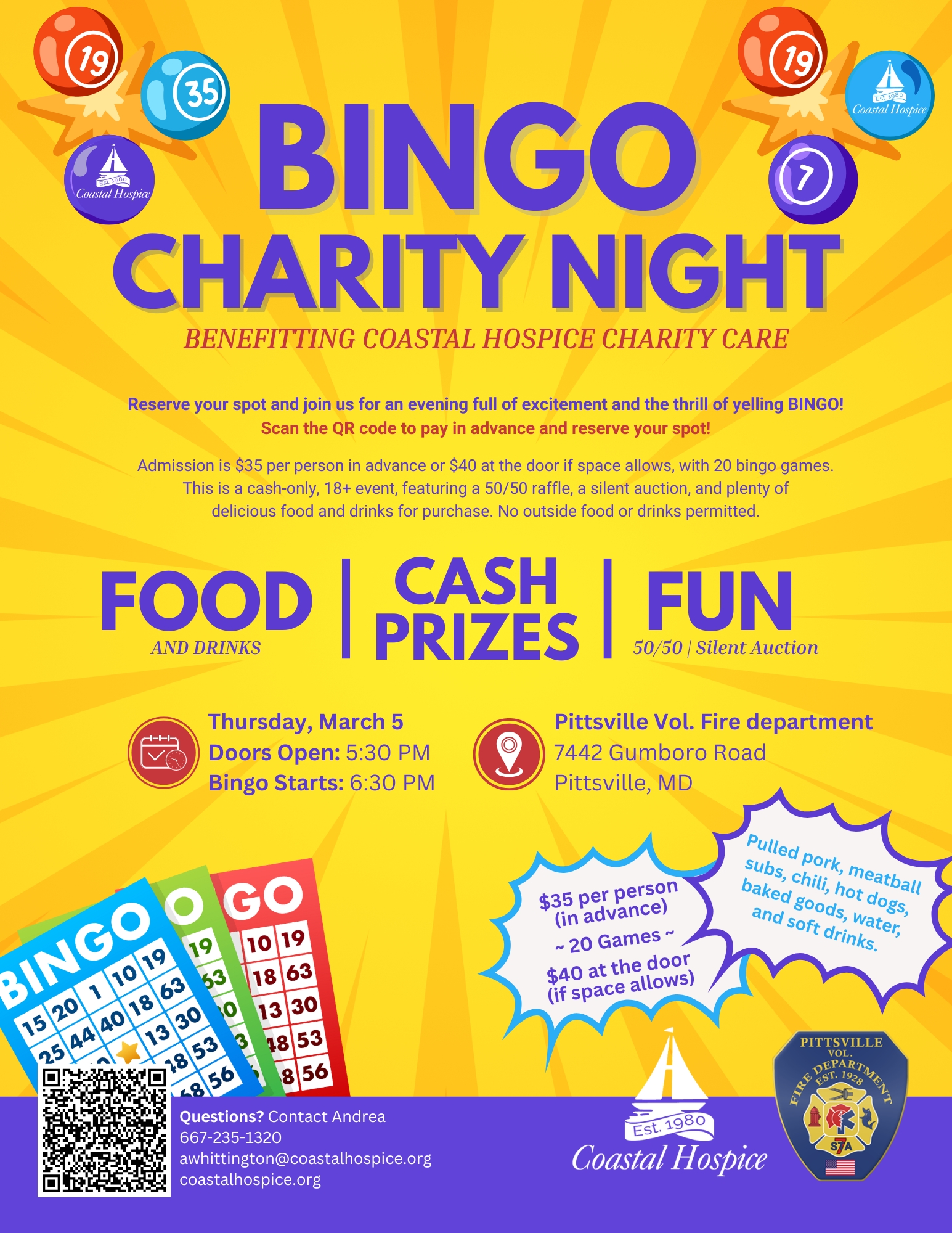 Admission is $35 per person in advance or $40 at the door if space allows, with 20 bingo games. This is a cash-only, 18+ event, featuring a 50/50 raffle, a silent auction, and plenty of delicious food and drinks for purchase. No outside food or drinks permitted.