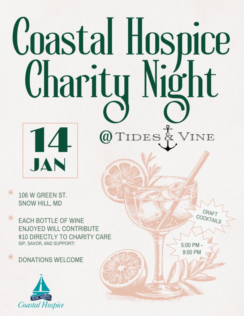 Join us for a fun night out at Blue Ruin in Cambridge, MD, on Saturday, March 21, from 5:00 – 9:00 PM, as they host a Charity Night benefiting Coastal Hospice Charity Care.