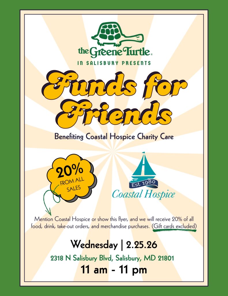 Ten percent of all food, drink, and Musical Bingo proceeds will be donated to support patients and families across Maryland’s Lower Eastern Shore including Dorchester County, which we are proud to serve.