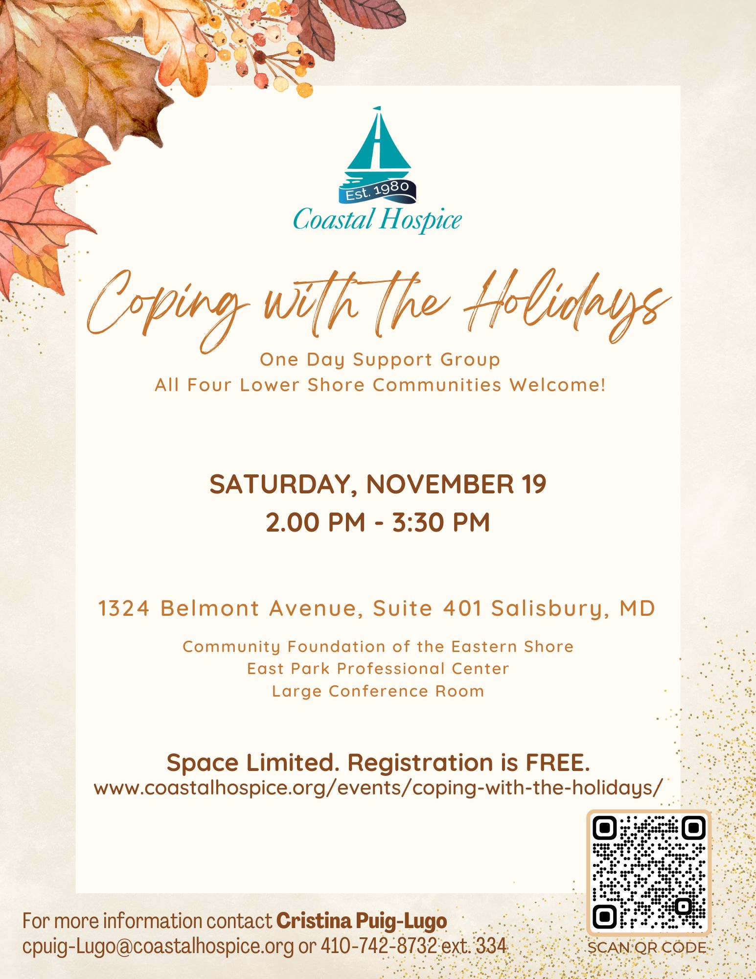 Community Foundation of the Eastern Shore 1324 Belmont Avenue, Ste. 401, Salisbury, MDCoping with the Holidays One Day Support Group - All Four Lower Shore Communities Welcome! For those who are grieving the death of a loved one, holidays can be very difficult because their absence can be deeply felt. As we gather, we will share some helpful tips, revise traditions and support one another during this […]