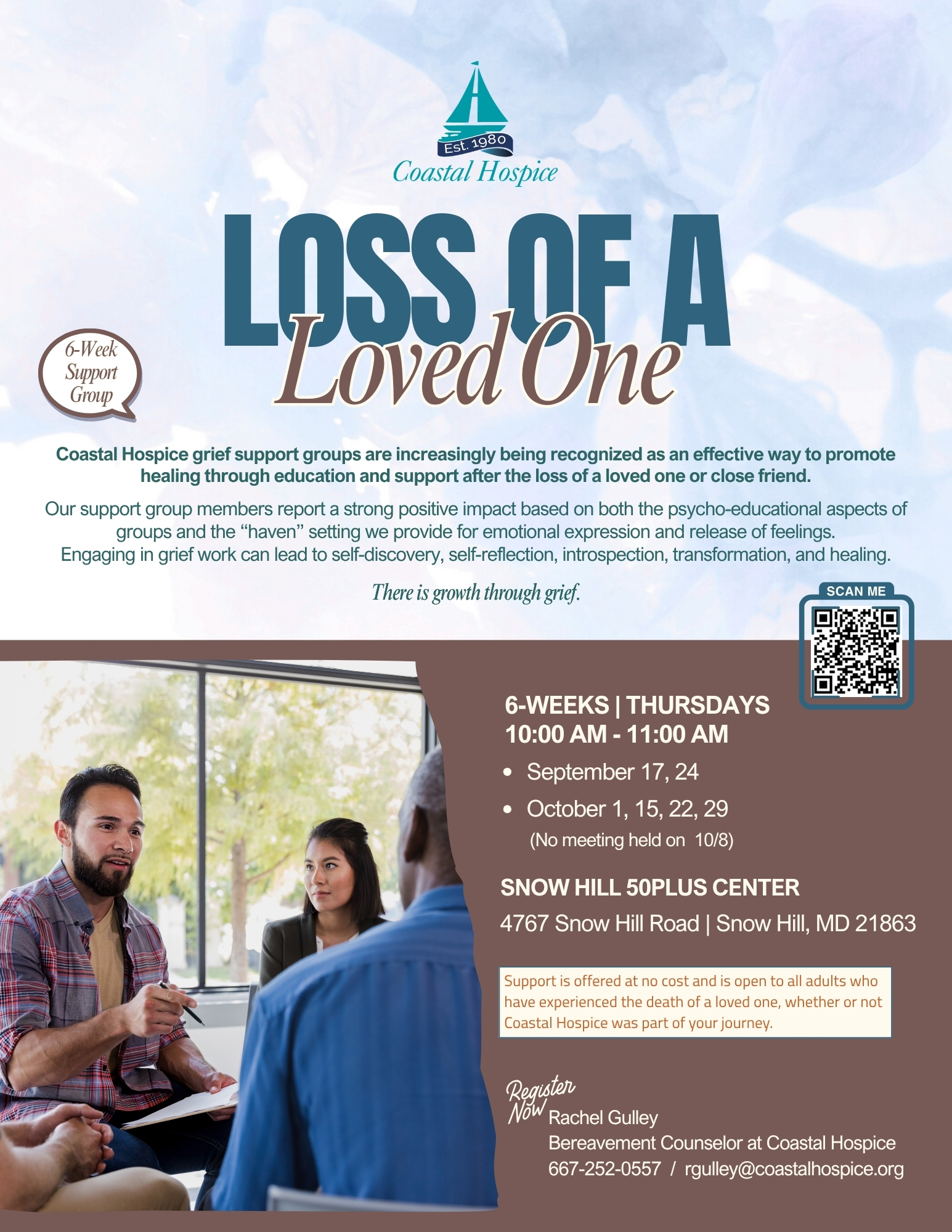To register, please email Rachel Gulley, Coastal Hospice Bereavement Counselor, by phone at 667-252-0557 or by email rgulley@coastalhospice.org. If leaving a message, please state the grief support group you are interested in attending.