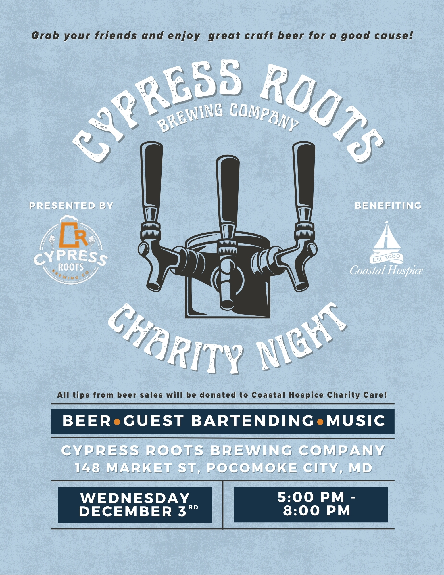 148 Market St, Pocomoke City, MDGrab your friends and come enjoy great craft beer for a good cause! Cypress Roots Brewing Company Charity Night benefiting Coastal Hospice Charity Care. Wednesday, December 3 5:00 PM - 9:00 PM Cypress Roots Brewing Company 148 Market St, Pocomoke City, MD Looking for a fun night out with friends and a way to give back? Join […]