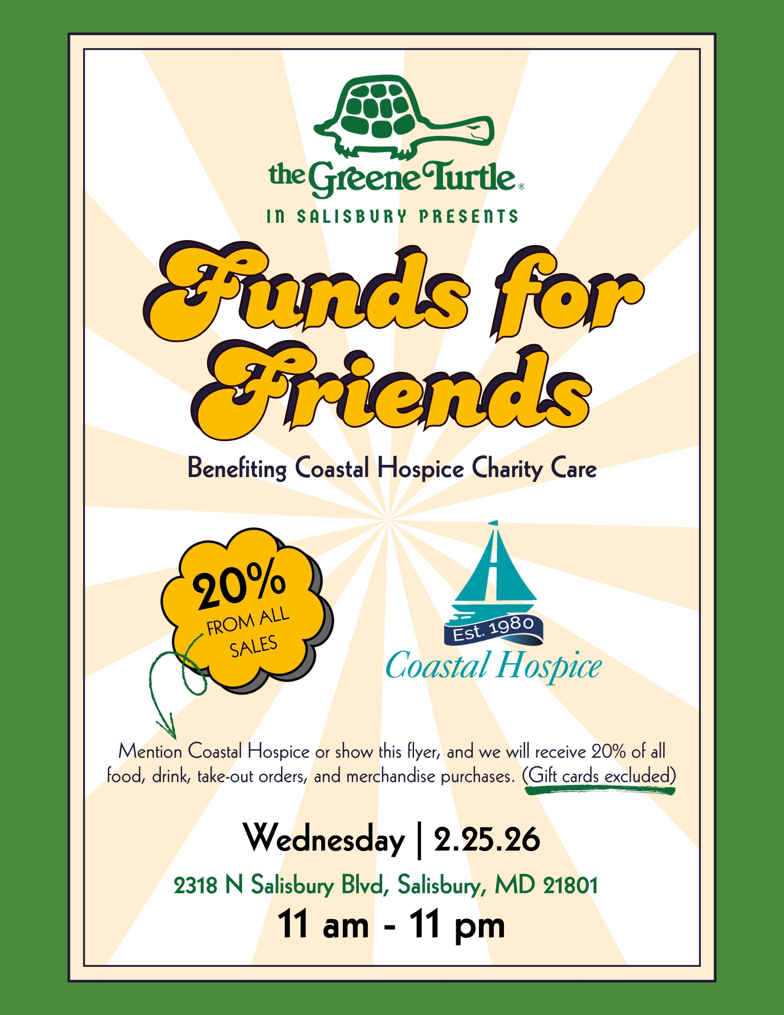 2318 N Salisbury Blvd, Salisbury, MD 21801Join Us at The Greene Turtle for “Funds for Friends”! The Greene Turtle in Salisbury, MD, is teaming up with Coastal Hospice to raise Funds for Friends! Mark your calendars, and come enjoy a meal, grab take-out, or shop while supporting a great cause! All proceeds benefit Coastal Hospice Charity Care. Simply mention “Coastal Hospice” […]