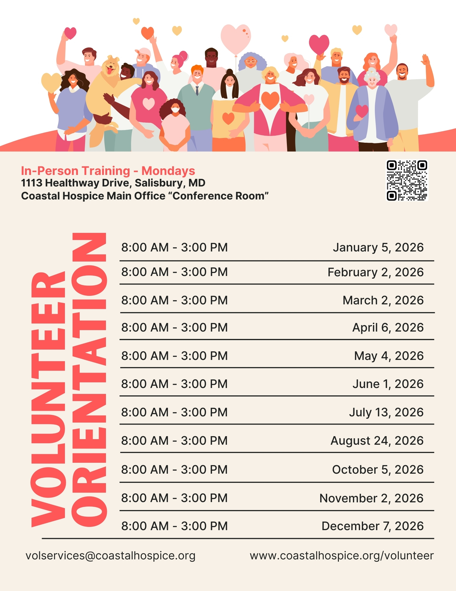 We invite you to consider becoming a Patient Care Volunteer. Coastal Hospice in-person Volunteer Patient Care Training will be held at Healthway Drive in Salisbury, MD. During this session, we will go over important policies, expectations, and provide an opportunity for you to ask any questions that you may have. If you are interested in attending, please contact us by email at volservices@coastalhospice.org or by phone 410-543-2590.